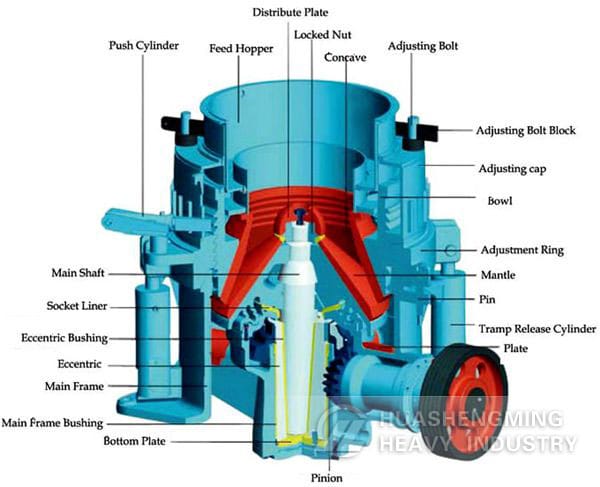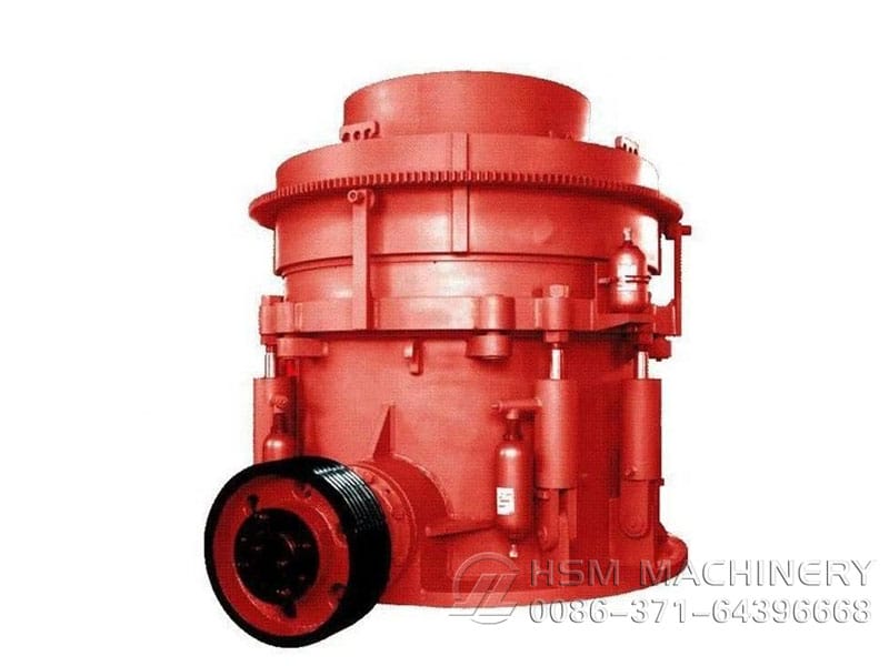When the cone crusher begins to work, the electric motor drives the eccentric sleeve through the spring coupling, drive shaft and a pair of angle gear, so that the crushing wall of cone crusher gets close to and then gets away from the surface of the rolling mortar wall fixed on the adjusting sleeve, and the ores inside the crushing chamber will be constantly impacted, squeezed and bent to be crushed.