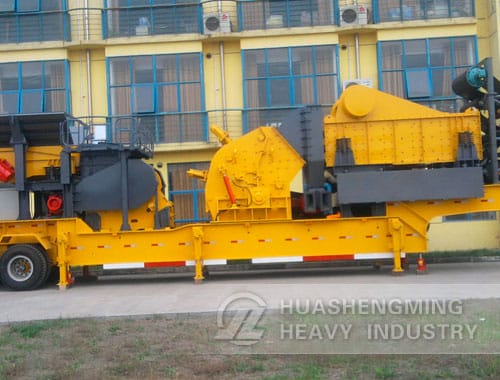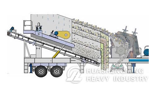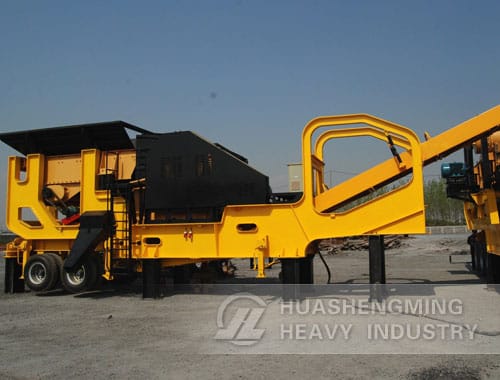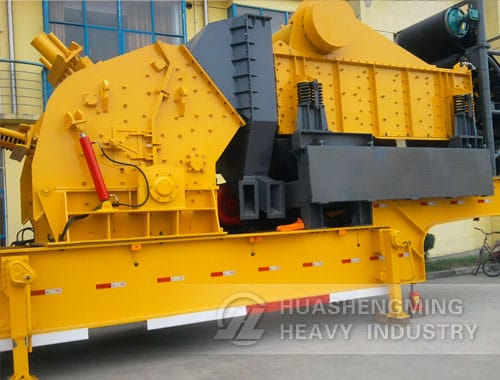 All parts of the mobile impact crushing plant are mounted on the truck, including: solid rack, impact crusher, feeder, vibrating screen, conveyor belts, motors and control boxes and other.