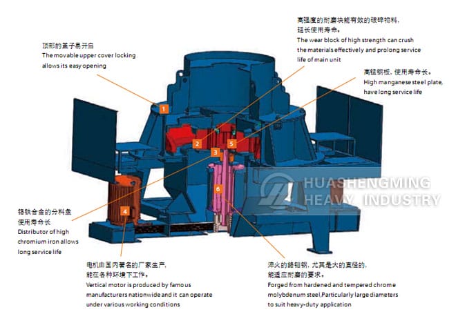 1. Materials enter impeller with high speed, impact materials around impeller under the function of high speed centrifugal force, and attack each other.